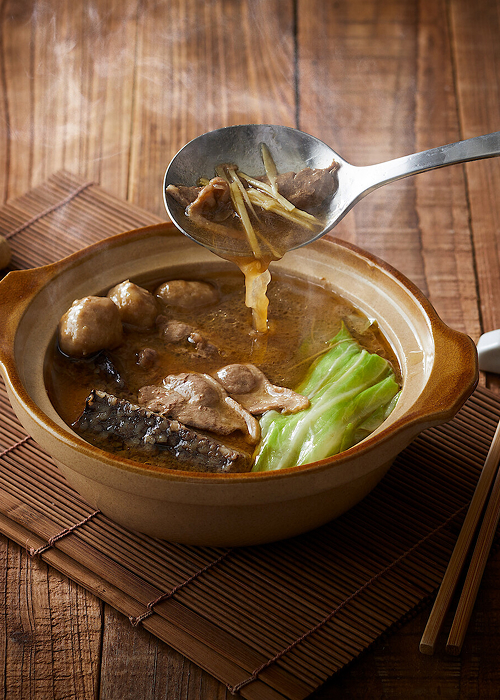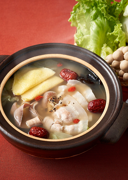 豬骨湯底加入當歸、紅棗、米酒等熬煮,醇厚湯頭散發微嗆白胡椒辛香,經典的港式煲湯湯底。