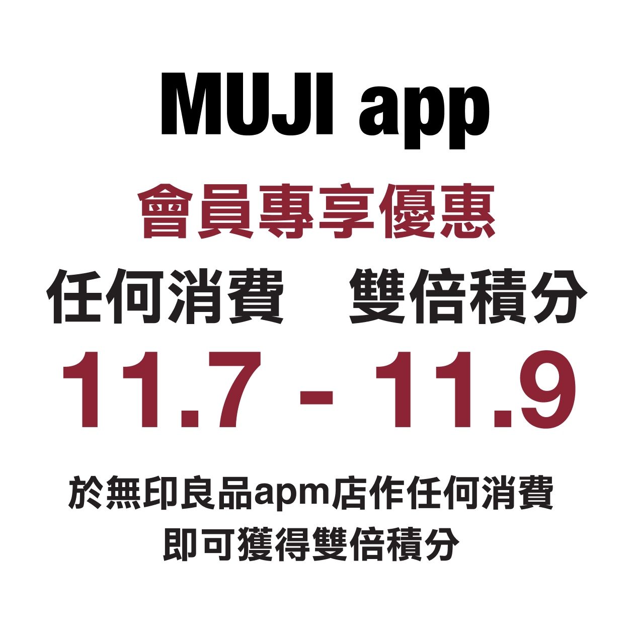 於2025年11月7至9日開業首三天期間,MUJI app會員於無印良品apm店作任何消費,可享雙倍積分獎賞,每消費$1 即可獲得2積分,每消費$2即可獲得4積分,如此類推。
