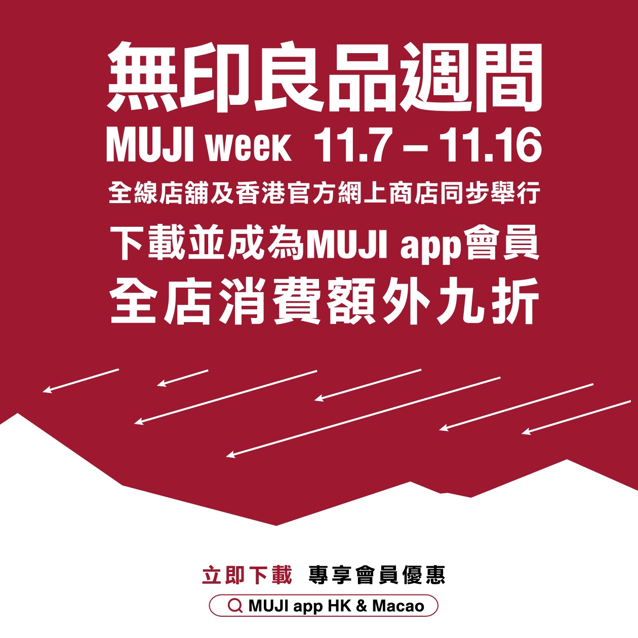 於2025年11月7日 至 16日期間,MUJI app 會員於全線無印良品店舖作任何消費,即可享有額外9折優惠。
